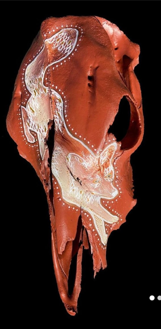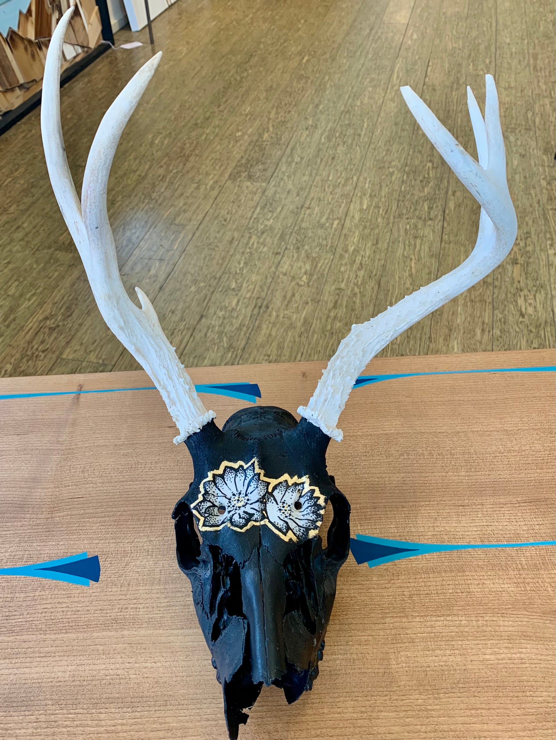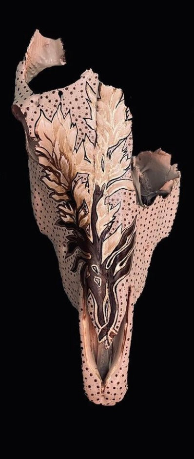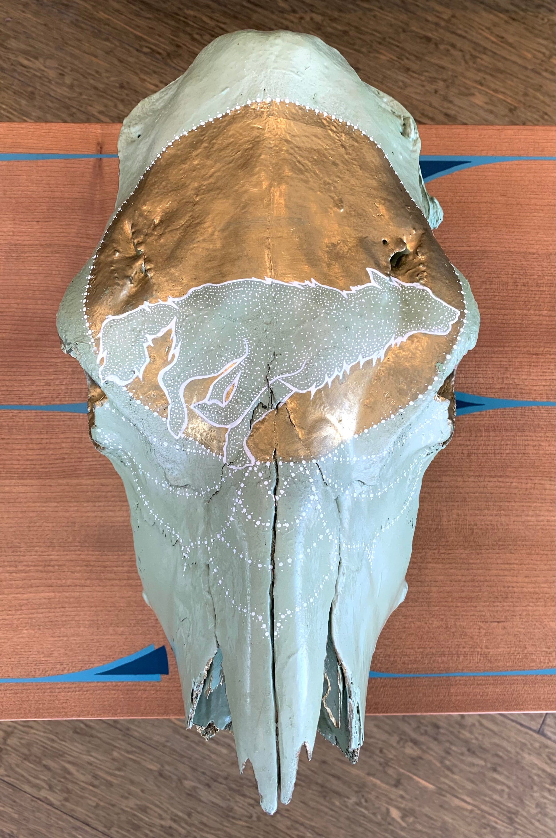 Inspired by her natural surroundings, Cathy hunts for and paints the skulls of bison, cow, deer and elk with iconic images of the west such as a howling wolf or an indian paintbrush flower. Cathay’s skulls are ready to hang with wire and can also be great as a sculptural piece sitting on a table.