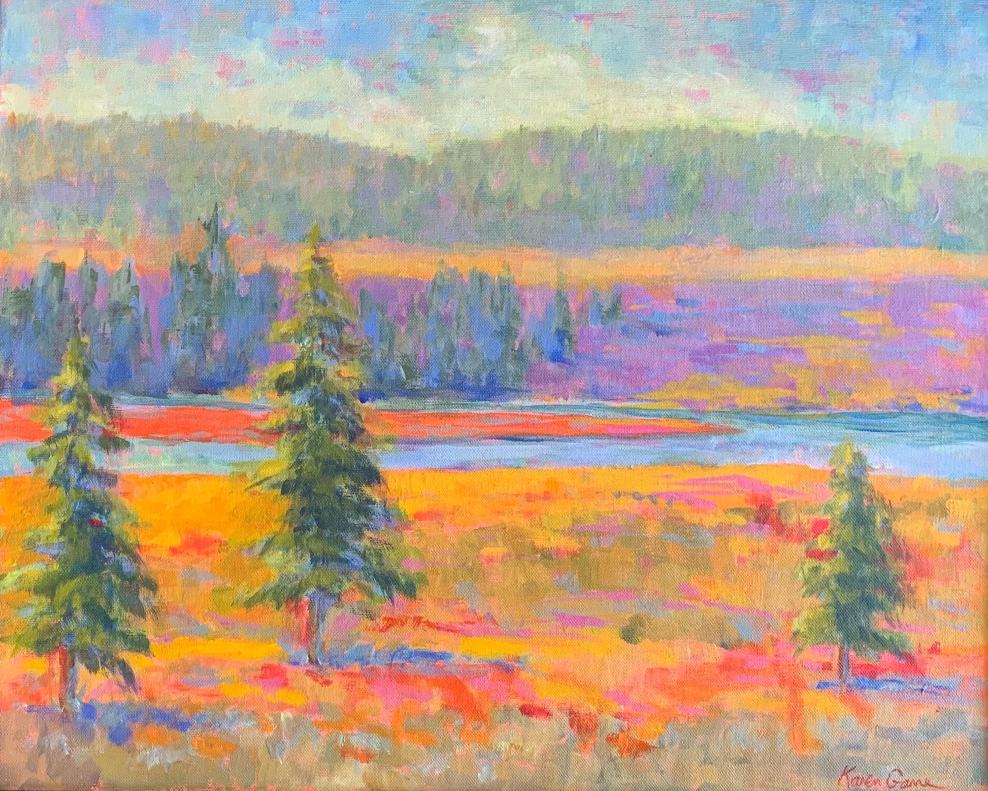 An impressionist painter in acrylics, with her own unique style. Karen most often builds her paintings by first putting down a bright colored underpainting, then applying arbitrary color as she sees fit for the emotions she wants to portray about the scene.