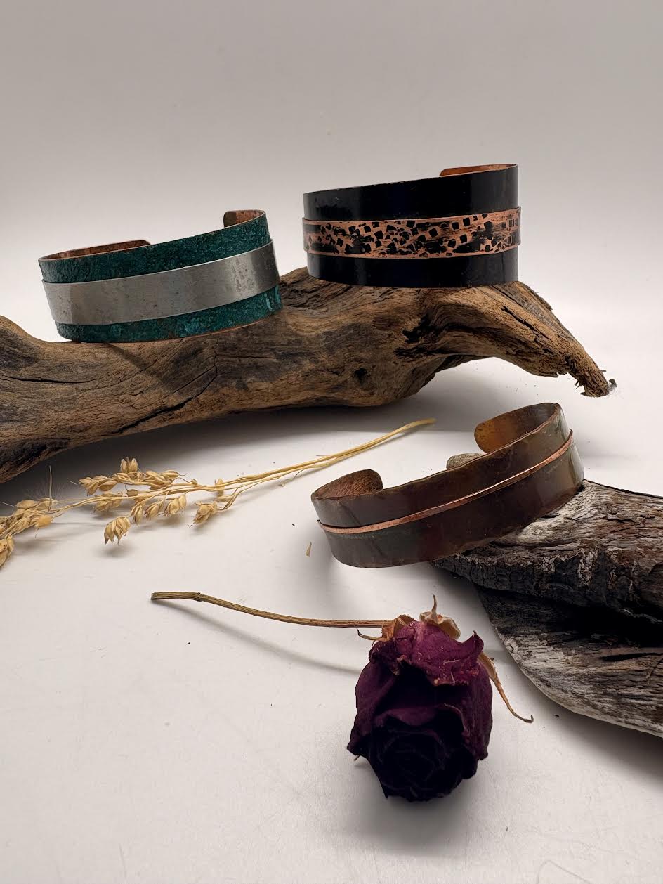 Unique jewelry utilizing recycled metal, including wire, pipe, and old copper pieces. Kay uses several recipes to patina the copper to create different variations of aged and rusted copper. Each piece of jewelry is sprayed with a light coating of polyurethane to hold the color. Earring hooks & necklace chains are hypoallergenic and nickel free.